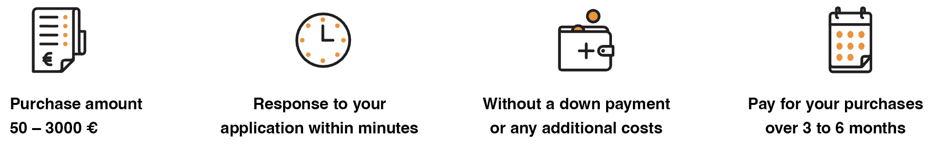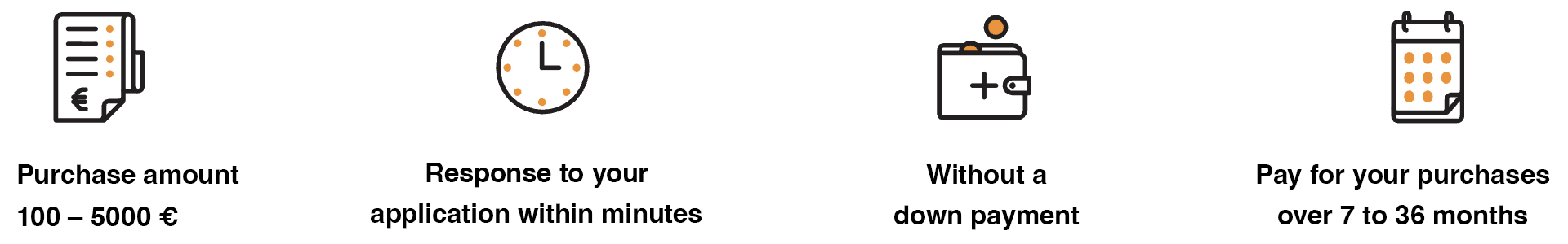 ***The annual percentage rate (APR) of the hire-purchase credit is 33.7% under the following sample conditions: the cash price of the item (net price) is €150, the credit amount is €150, down payment is €0, the contract period is 24 months, the fixed annual interest rate is 14.9% calculated on the purchase amount, the contract fee is €5, and the monthly administration fee is €0. The monthly installment is €8.11, and the total amount of credit and repayments is €200.26.